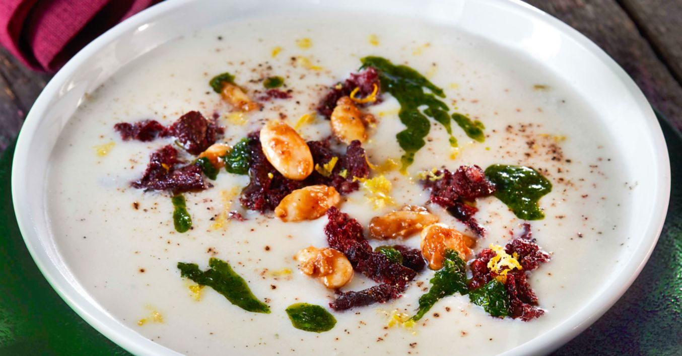 Zupę rozlać na talerze, dodać migdały i kaszankę, podawać ozdobioną olejem pietruszkowym i skórką z cytryny.