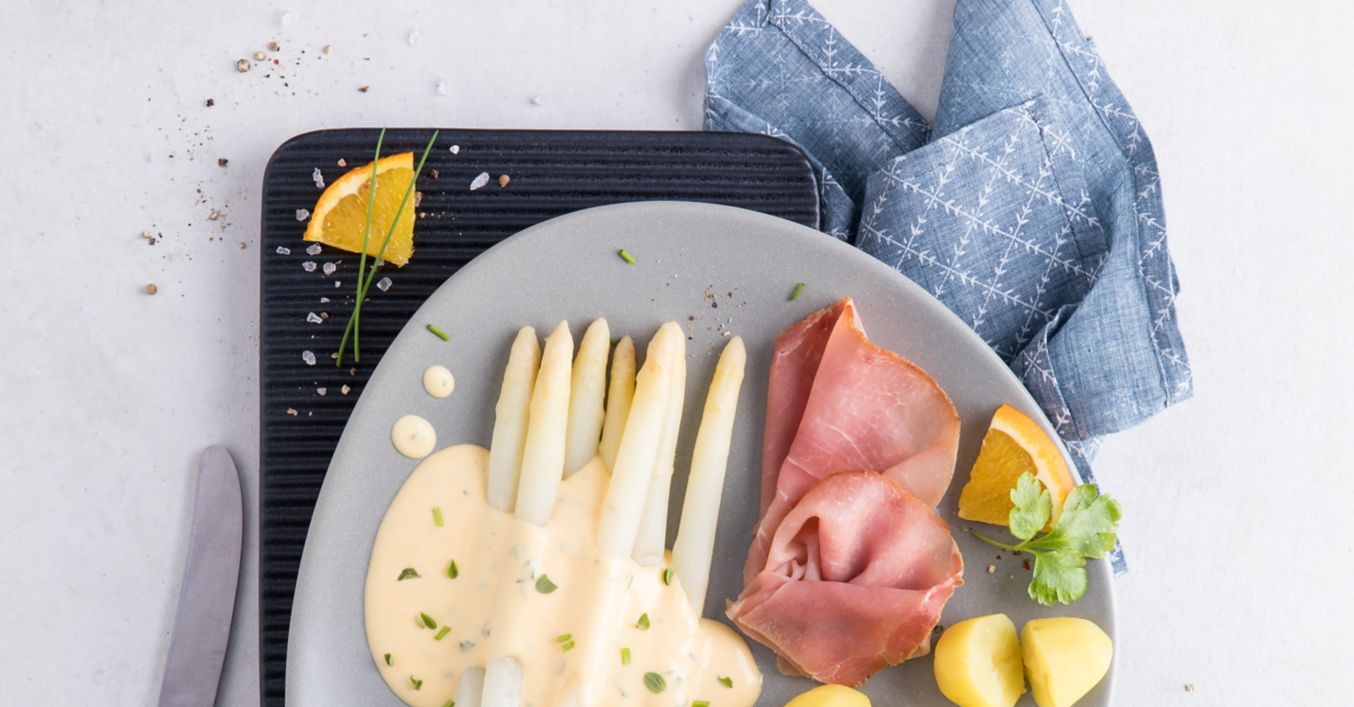 Szparagi, ziemniaki i szynkę układać na talerzach i podawać z sosem.