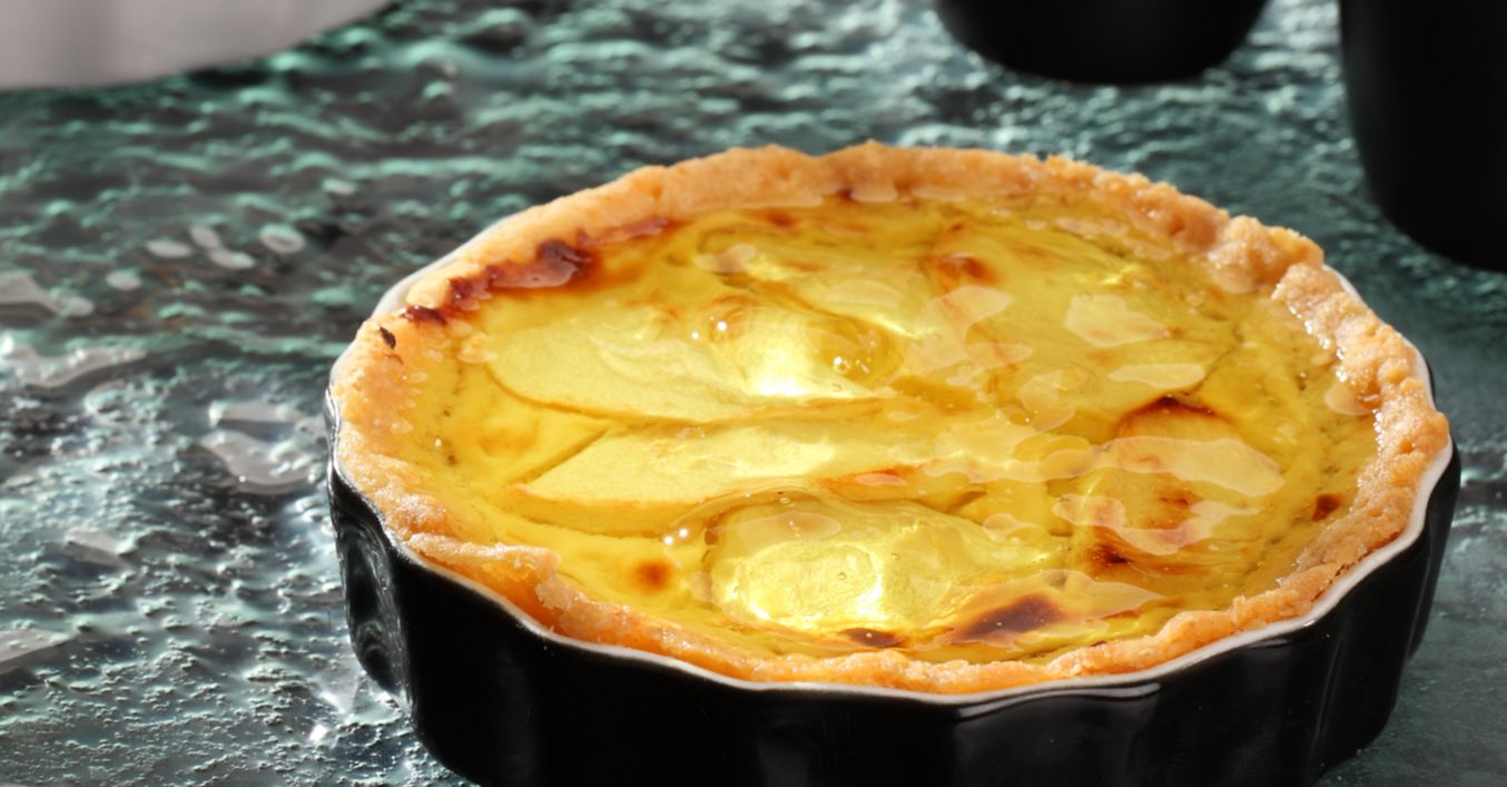 W tym czasie przygotować cytrynowy krem. Żółtka utrzeć z cukrem, wymieszać z łyżeczką mąki, zalać gorącym mlekiem i mieszając zagotować. Dodać skórkę otartą z cytryny i wyciśnięty z niej sok. Jabłka umyć, obrać, wykroić gniazda nasienne, pokroić na półplasterki. Schłodzone ciasto rozwałkować na grubość 3-4 mm, przenieść na wałku i nałożyć na ustawione obok siebie foremki cienko posmarowane masłem. Przycisnąć wałek i odciąć nadmiar ciasta. Ciastem wylepić foremki, nakłuć widelcem, przykryć krążkami pergaminu, obciążyć suchym grochem i podpiec na złoty kolor przez 10 minut w temperaturze 180 stopni.