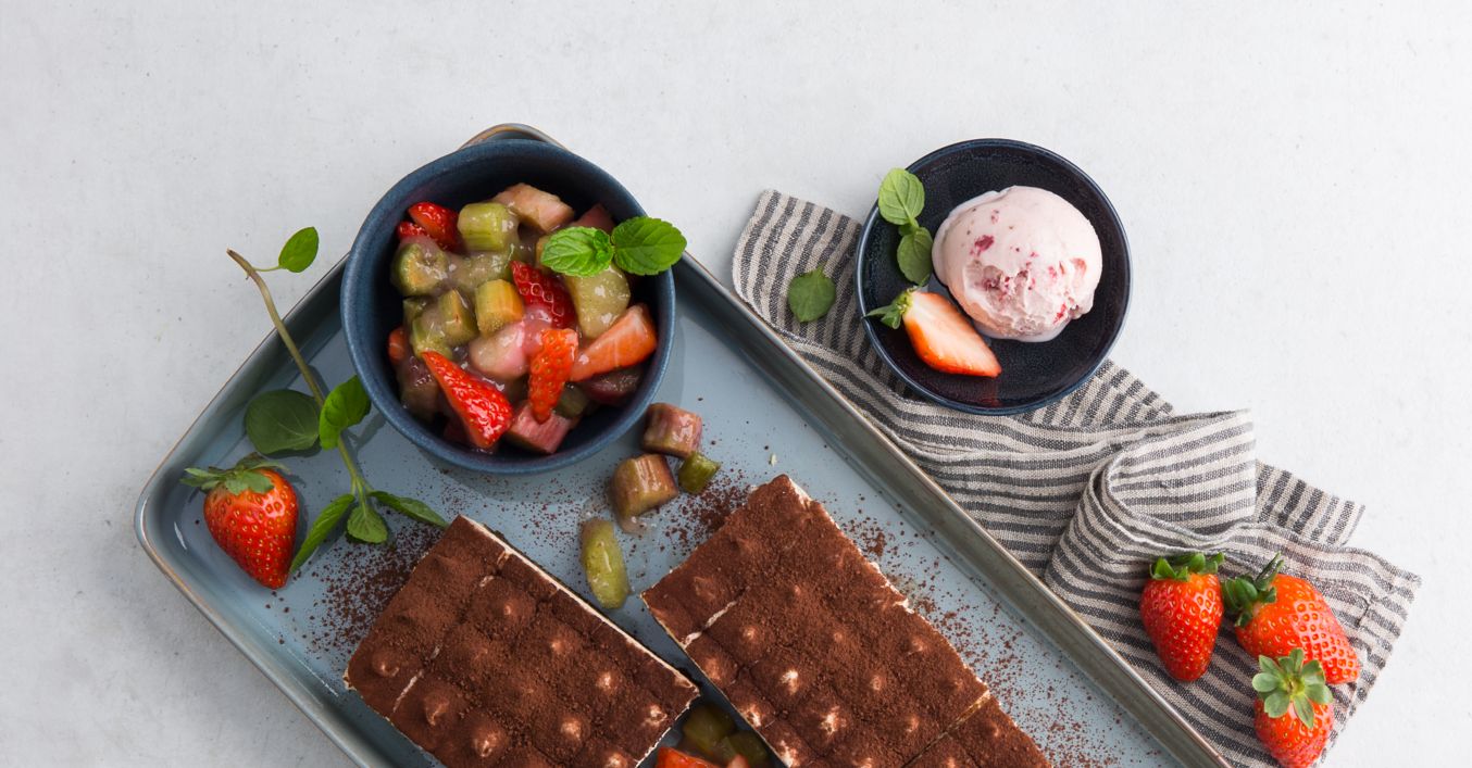 Do sosu rabarbarowego dodać truskawki i wymieszać. Tiramisu pokroić na 4 kawałki i podawać z sosem owocowym – można też podać z lodami truskawkowymi i listkami mięty.