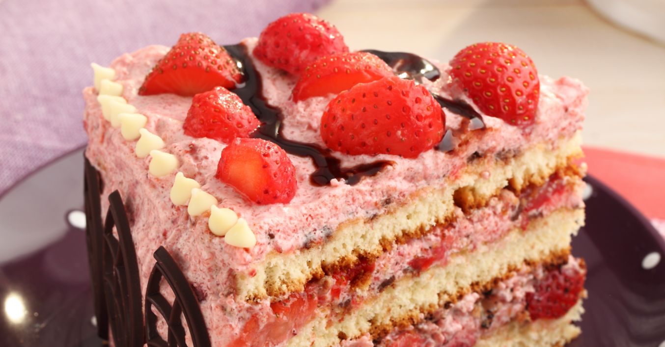 Śmietanę ubić na sztywno i delikatnie wymieszać z masą. Krem schłodzić przez 5- 10 minut. Umyć owoce do dekoracji. 2/3 truskawek pokroić w plasterki, pozostałe w połówki. Krążki ciasta posypać wiórkami gorzkiej czekolady, rozprowadzić na nich masę. Dwa krążki udekorować plasterkami truskawek, trzeci połówkami owoców, wstawić na 10 min do lodówki, aby krem stężał. Następnie piętrowo nałożyć na siebie krążki. Tort wstawić na 1,5 godz. do lodówki. Chwilę przed podaniem udekorować czekoladowymi listkami.