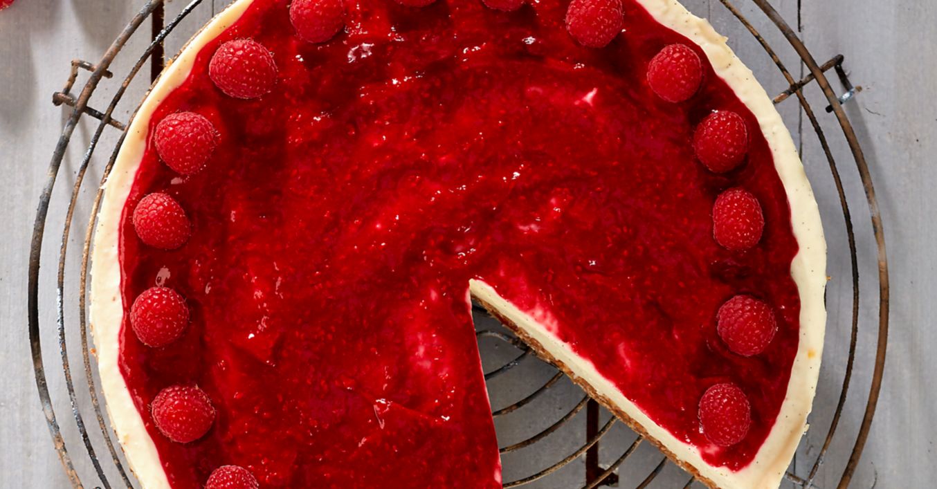Przebrać maliny, 300 g zmiksować. Ciasto wyjąć z formy i podawać udekorowane pureé malinowym oraz resztą owoców.