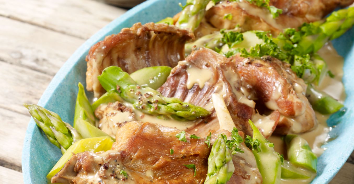 Królika rozmrozić, umyć, osuszyć papierem kuchennym, podzielić na 8 części, doprawić solą i pieprzem. Smażyć na rozgrzanym oleju z każdej strony przez ok. 5 minut w garnku, który można umieszczać w piekarniku. Mięso podlać rosołem, dodać śmietanę i pietruszkę, wymieszać. Garnek wstawić do piekarnika o temp. 180°C (termoobieg 160°C), dusić ok. 45 minut. Po ok. 20 minutach dodać szparagi.