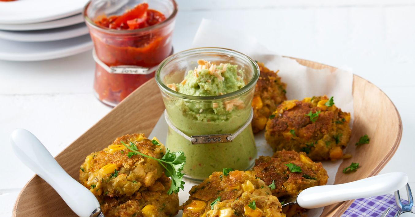 Ciecierzycę i zielony groszek osączyć i spłukać, zgnieść widelcem, wymieszać z pietruszką i bułką tartą i przyprawić solą, pieprzem i curry. Dodać kukurydzę i całość ostrożnie zagnieść. Z mieszanki warzywnej uformować 20 kulek i usmażyć w 3 łyżkach rozgrzanego oleju na kolor złotobrązowy. Obrać cebulę i pokroić na małe kosteczki. Pomidory umyć i przekroić na pół.
