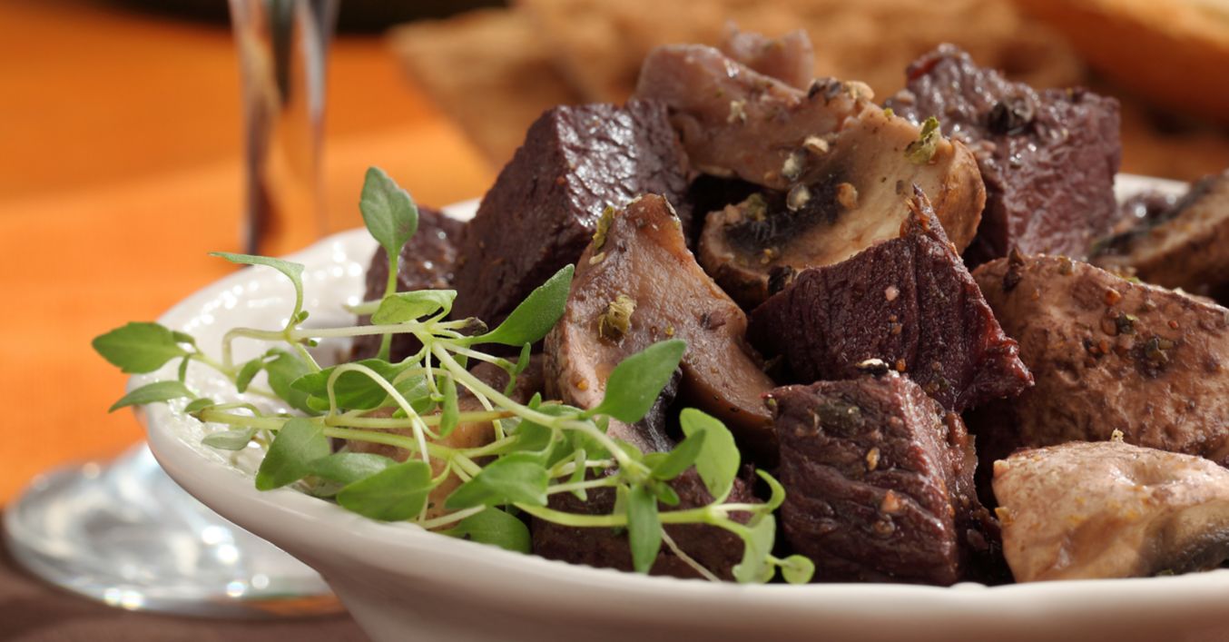 Mięso wrzucić na gorącą oliwę, obsmażyć z każdej strony, zalać ¼ l wody i winem, dodać przyprawę do pieczeni, zagotować. Dusić na małym ogniu przez 30 – 40 minut. Pieczarki wyczyścić, pokroić w ćwiartki i dodać do gulaszu. Dusić kolejne 30 minut, doprawić solą i pieprzem.