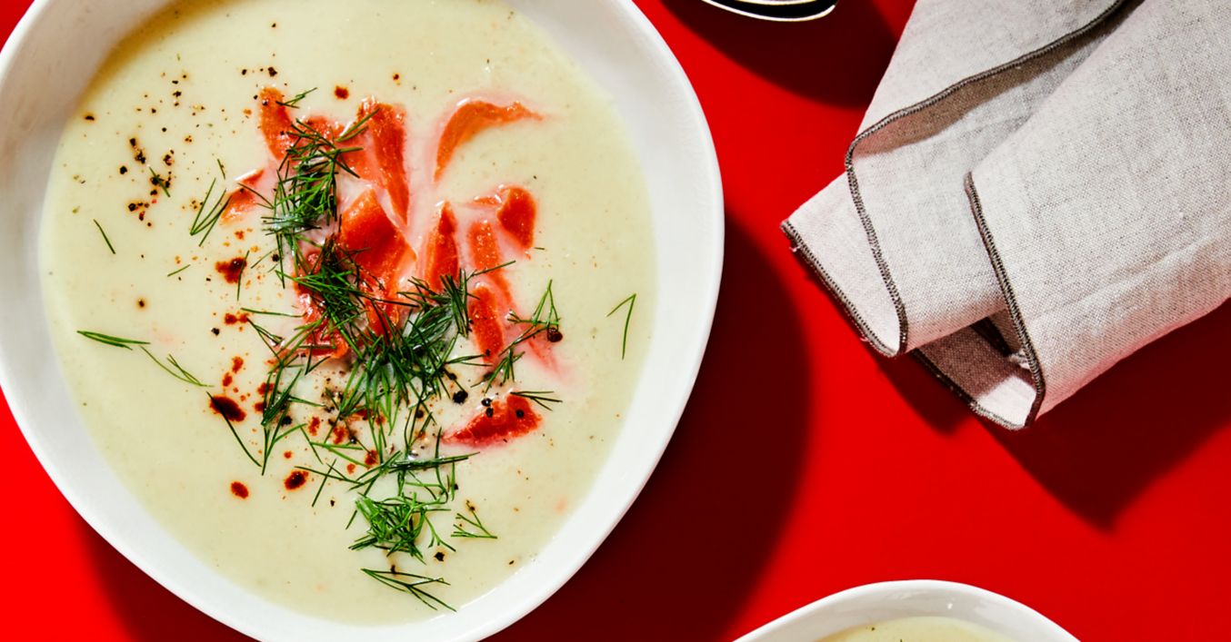 Łososia pokroić w paski. Koper umyć i osuszyć. Zupę rozlać do misek, z wierzchu udekorować koperkiem i podawać z rybą.
