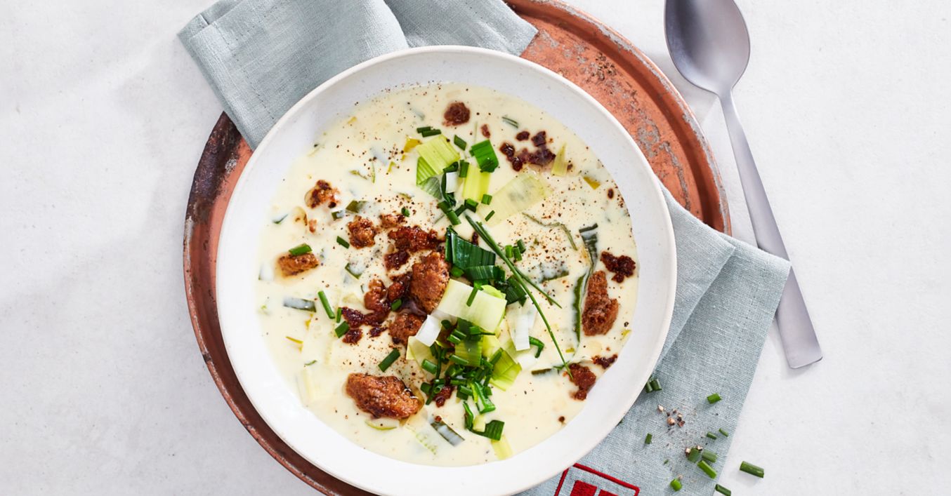 Pory przepołowić wzdłuż, dokładnie umyć, osuszyć z nadmiaru wody, oczyścić i pokroić w cienkie paski. W garnku rozgrzać olej i masło. Dodać mięso mielone i przez chwilę podsmażać. Dodać pory i krótko poddusić je z mięsem. Wsypać mąkę, wymieszać, a następnie zalać całość bulionem. Dodać serek topiony i dokładnie wymieszać. Zupę gotować na średnim ogniu przez około 10 minut, na koniec doprawić solą i pieprzem.