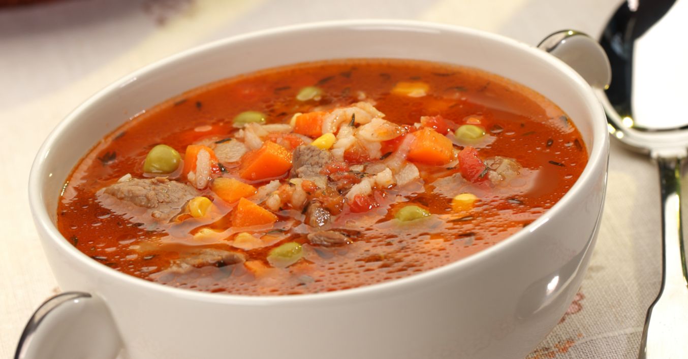 Dołożyć rozdrobnione pomidory z puszki wraz z zalewą. Wsypać osączoną kukurydzę i zielony groszek. Zupę gotować jeszcze na małym ogniu przez około 10-15 minut. Ponownie doprawić do smaku. Podawać udekorowaną kleksem śmietany i świeżymi ziołami.