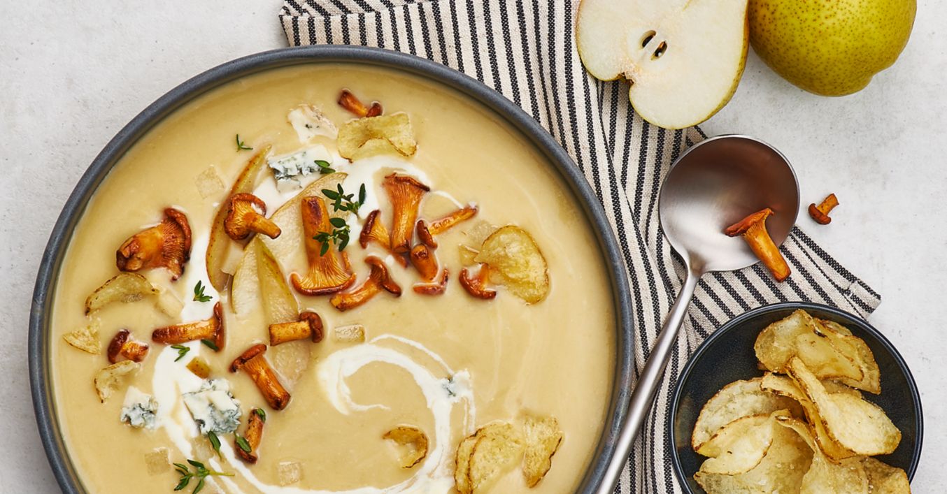 Cebulę obrać i pokroić na kawałki. Gruszki i ziemniaki obrać, z gruszek usunąć gniazda nasienne. 2½ gruszki oraz ziemniaki pokroić w kostkę o boku ok. 2 cm. Pozostałą połowę gruszki pokroić w drobną kostkę i odłożyć. Por przepołowić, umyć, oczyścić i pokroić na plasterki.